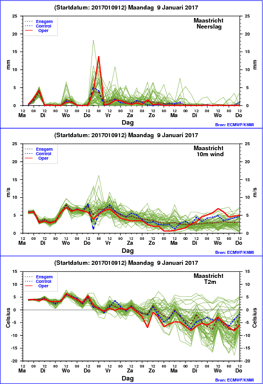 Aan de noordflank van de uitslaande golf in het polaire front kan de neerslag donderdagavond en in de nacht naar vrijdag grotendeels in de vorm van sneeuw vallen. In het zuidoosten zien we in de loop van de nacht naar vrijdag een beeld met voornamelijk sneeuw (grote sneeuwfractie): regionaal 5-10 cm sneeuw behoort daar zeker tot de mogelijkheden. Hoe verder naar het noordwesten hoe kleiner de sneeuwkansen en -hoeveelheden bij deze golf. Bij het Noordzeelaagje van vrijdag kunnen geclusterde winterse buien voorkomen, mogelijk ook weer met regionale sneeuwaccumulaties. Bovendien is er dan in de kustgebieden een redelijke kans op zware windstoten (Vlissingen en Den Helder iets meer dan 50% kans). In het weekend slechts langzaam afnemende neerslagkansen en vooral dieper landinwaarts nog steeds een grote kans dat sneeuw daarbij overheerst. In de loop van maandag 16 januari wordt de kans op een aflandige wind groot, zie ook de windrichtingspluimen. De kans op een reeks ijsdagen vanaf dinsdag 17 januari (mogelijk maandag al) is landinwaarts vrij groot. In het oosten en zuidoosten zien we vanaf dinsdag een reeks van 5 dagen met een kans van 50-80% op een ijsdag. Rond donderdag de 19e is de kans op strenge vorst aanzienlijk: voor Maastricht > 60%. Richting het weekend van 21/22 januari wordt het onzeker of de vorst gehandhaafd blijft: we zien dan een trend naar een Balkanhoogscenario.