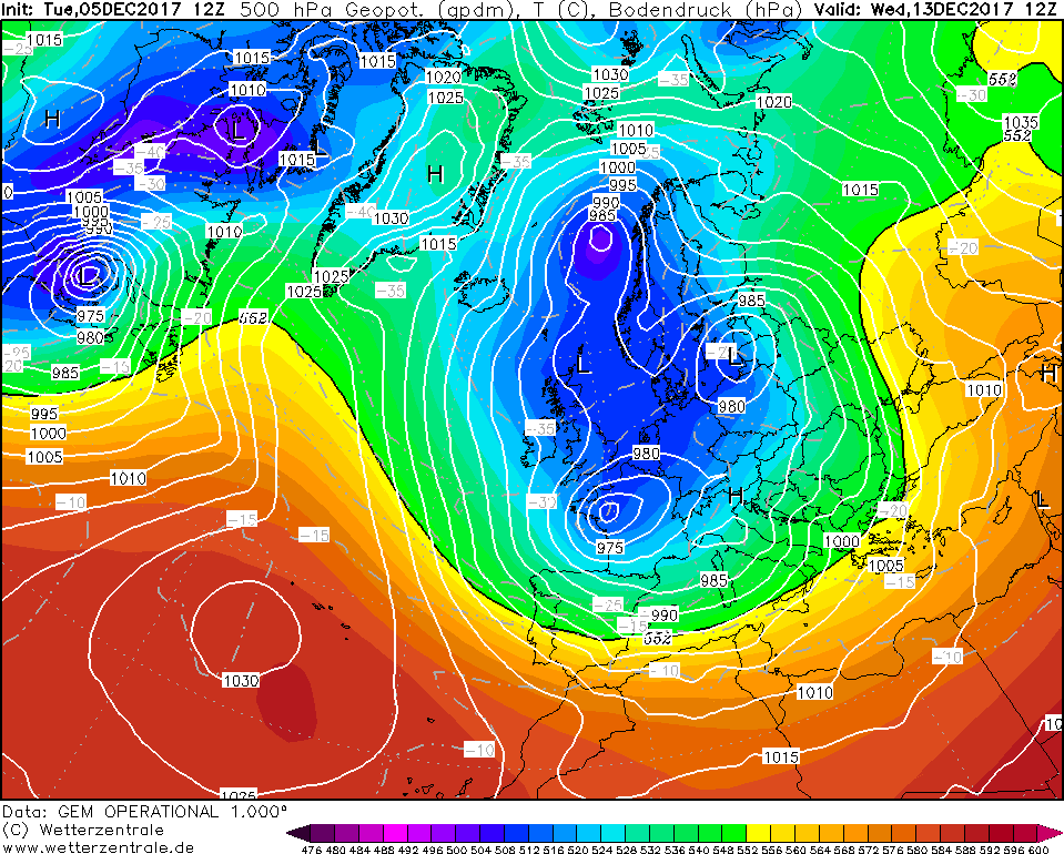 Mij valt vooral het gebrek aan een Azorenhoog op (wat goed is voor de winter). Dat hadden we in december 2010 ook, en aangezien 2010 ook een actief orkaanseizoen was, met gelijkaardig type orkanen als dit jaar, doet me dit vermoeden dat er een verband is tussen de ACE (Accumulated Cyclone Energy), vooral boven specifieke breedtegraden en het Azorenhoog. Toen Ophelia trouwens naar Europa bewoog, ging het ook door een wat normaalgezien een hogedrukgordel zou moeten zijn, die ervoor zou moeten zorgen dat de orkaan niet daar in de eerste plaats ontstaat, omdat er daar geen vochtige lucht (afgedwaald van Kaapverdie) zou moeten belanden, in combinatie met heel warme zeewateren, en een zeer diepe hoogtetrog (met koude bovenluchten (botsend op vochtige lucht met recordwarm zeewater en een gebrek aan schering, ingrediënten voor een killer hurricane op een plaats waar dit normaal niet zo hoort te zijn). Schering is er normaal doorgaans niet op die plaats, maar een hogedrukgordel zorgt voor bescherming tegen die orkanen en vochtige lucht, en heeft bovendien gortdroge lucht doorgaans, en dat was toen niet het geval.