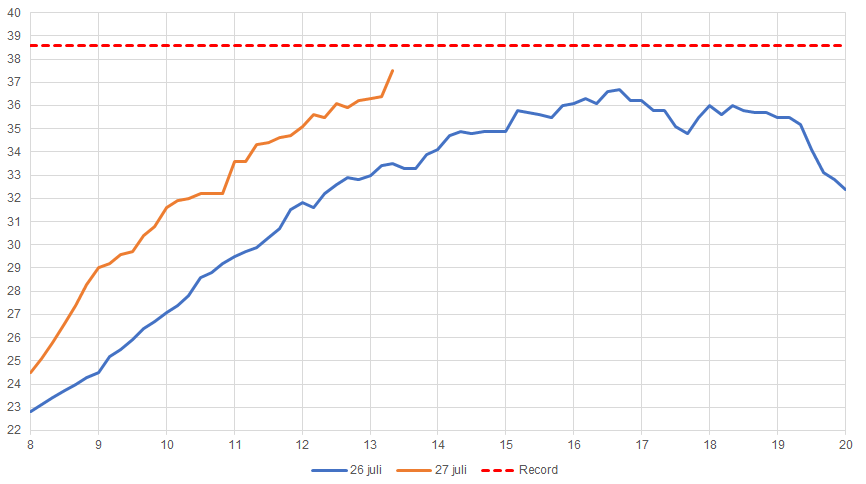 Blauwe lijn = gisteren, rode stippelijn = all-time record, rode lijn = vandaag