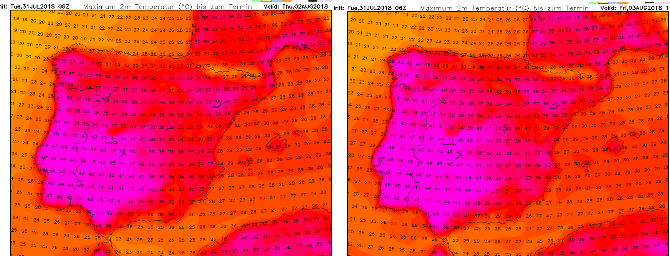 Het Europees (48°C in Athene), Iberisch (47,4°C in Amaraleja in Portugal) , Portugees en Spaans record komen wel allen onder gevaar. De warmste temperatuur gemeten bij Alcacer Do Sal (waar de 52°C graden ingetekend wordt voor 4 augustus, heeft een record dat tussen 46 en 46,5°C ligt).