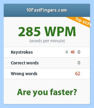 Ik weet niet hoeveel ik per minuut typ, of hoe snel precies (heb geen zin om die test te doen