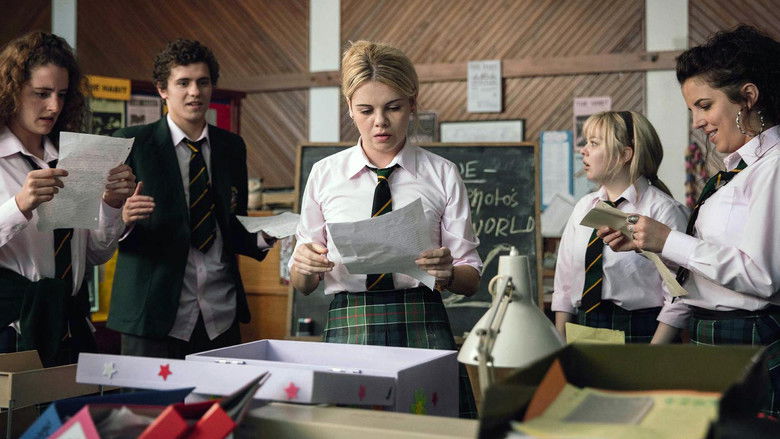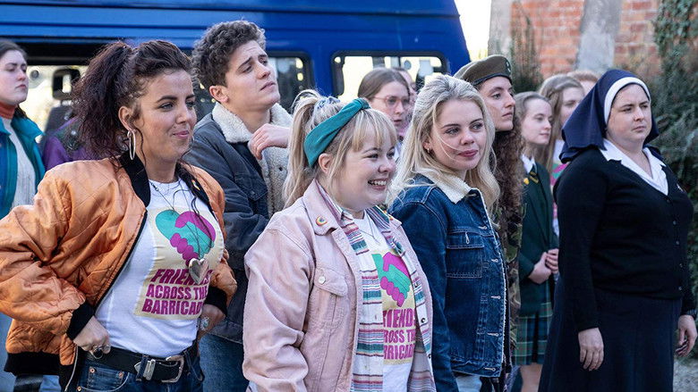 Derry Girls is set in 1994 and that is a troubled time in Northern Ireland. Armed agents and army checkpoints are part of the daily life of 16-year-old Erin and her friends. Erin lives with her mother who tolerates no contradiction, her father and grandfather Joe who cares about his daughters and granddaughters, but less with his son-in-law. Although Northern Ireland is in the news every day, she has her own problems: she is terrible with boys and no one understands her. She also has to deal with her cousin Orla McCool who lives next door with her mother Sarah. Orla is quite unpredictable and lives in her own world. Her friend Clare is especially smart and ambitious, while Michelle is big-mouthed and wants a boyfriend. Michelle's nephew, James has just moved to Derry and is an outsider with an English accent, because of that accent he also has to go to girls' school because the boys' school would be too dangerous, but that turns out to be a disappointment.